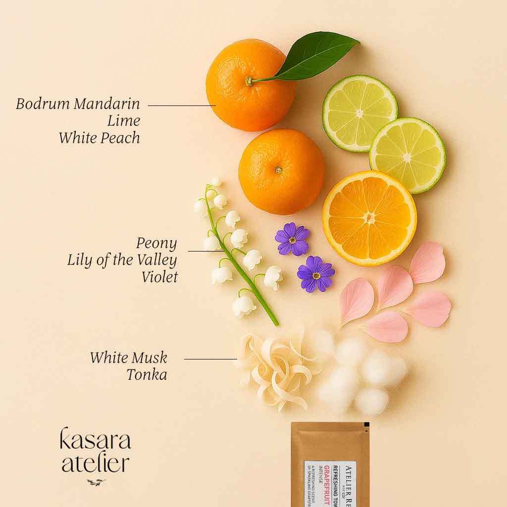 Discover the unique and refreshing fragrance of Bodrum Tangerines with these premium refreshing wipes. Infused with the zesty aroma of Bodrum tangerines, complemented by fresh lime and delicate white peach, this scent will brighten your day.